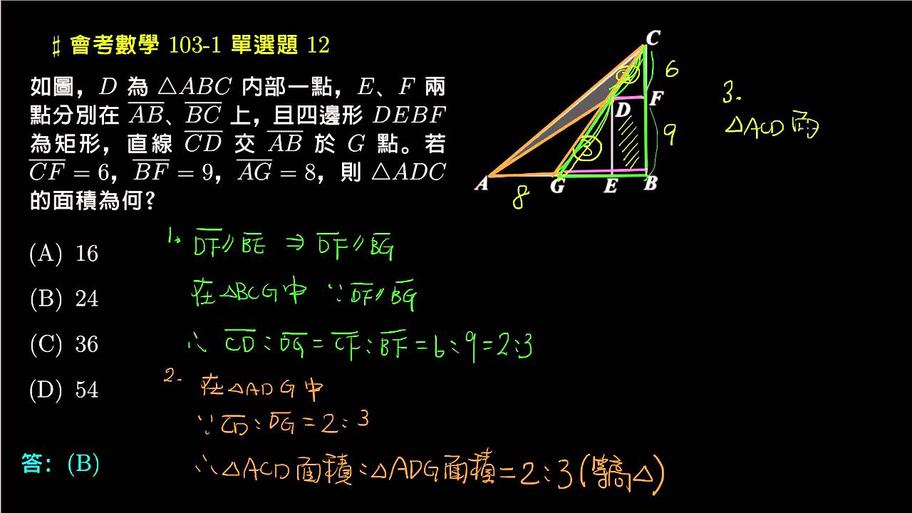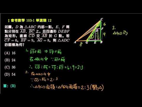 載入中... 相關課程 Back 【會考數學】103v1 單選12:平行線截比例線段與等高三角形面積比 相關課程 0 / 750 登入觀看 ⇐ Use this menu to view and help create subtitles for this video in many different languages. You'll probably want to hide YouTube's captions if using these subtitles. 【會考數學】103v1 單選12:平行線截比例線段與等高三角形面積比 上傳學習單 下載學習單